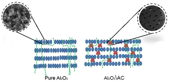 Comparison of Al2O3 and Al2O3/activated carbon hybrid membrane. The inclusion of carbon in the aluminum oxide matrix can increase the porosity of the structure, thereby causing additional microchannels for water to pass through the membrane. This leads to an increase filtration and adsorption efficiency. Diagram taken from [88].