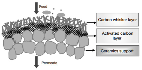 Bae et al. [90] developed an activated carbon membrane modified with carbon filaments for wastewater and potable water treatment. The carbon filaments have a positive effect on the service life of the membrane by preventing sedimentation and accumulation of particles (Figure 7). The adsorption capacity of this membrane in the phenol removal process was comparable to that of commercially available activated carbon, but with significantly better stability.