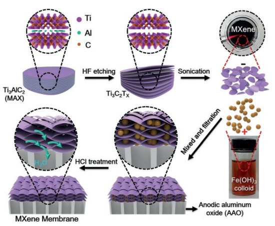 Ding et al. [95] fabricated a 2D lamellar membrane from MXene. The 2D MXene membranes were prepared using synthesized MXene nanosheets filtered on porous AAO (anodic aluminum oxide). The water permeability of MXene membranes is approximately 5 and 10 times higher than membranes not filtered on AAO. In [94] it was shown that desalination of salt water by membrane distillation is promising due to 100% theoretical salt removal capability.