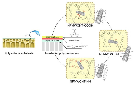 Schematic illustration for the preparation of different nanocomposite NF membranes via interfacial polymerization [106]. Reprinted with permission from { Xue, S.M.; Xu, Z.L.; Tang, Y.J.; Ji, C.H. Polypiperazine-Amide Nanofiltration Membrane Modified by Different Functionalized Multiwalled Carbon Nanotubes (MWCNTs). ACS Appl. Mater. Interfaces 2016, 8, 19135–19144, doi:10.1021/acsami.6b05545}. Copyright 2022 American Chemical Society.