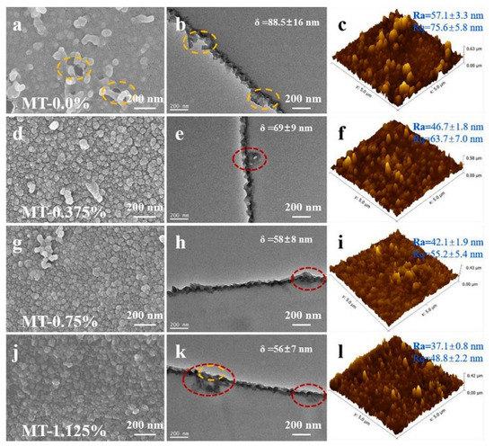 SEM images of the top view of nanofiltration membranes (NFMs) (left), TEM image of cross-sectional views for PA layers (middle) and AFM topographical images of NFMs (right): (a–c) MT-0.0%, (d–f) MT-0.375%, (g–i) MT-0.75%, and (j–l) MT-1.125%. Yellow circles indicate defects and red circles represent HF-MoS2, diagram taken from [97].