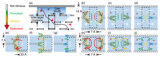 Summary of the individual influences of the three kinds of edge functional groups on water transport under different geometric membrane structures. (a) Illustration of the membrane system. Geometric structures of the membranes are (b–d) 7 × 14, (e–g) 23 × 7, and (h–j) 7 × 7, and their edge functional groups are (b,e,h) –COOH, (c,f,i) –OH, and (d,g,j) –H. Green, orange, red, and white parts of the arrows illustrate the promoted, neutral, restricted, and not obvious influences from the edge functional groups, respectively [138]. Reprinted with permission from {Qiu, R.; Yuan, S.; Xiao, J.; Chen, X.D.; Selomulya, C.; Zhang, X.; Woo, M.W. Effects of Edge Functional Groups on Water Transport in Graphene Oxide Membranes. ACS Appl. Mater. Interfaces 2019, 11, 8483–8491, doi:10.1021/acsami.9b00492}. Copyright 2022 American Chemical Society.