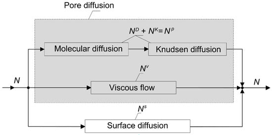 It turns out that in multicomponent mixtures containing compounds with different molar masses, a total pressure gradient develops in the porous material [,]. This arises as a consequence of the difference in the Knudsen diffusion rates of the individual components. For this reason, the definition of molar flux density (10) needs to include an expression for viscous flow. This term introduces an additional mass transport mechanism which, unlike Knudsen diffusion, is not a separative mechanism with respect to individual substances.