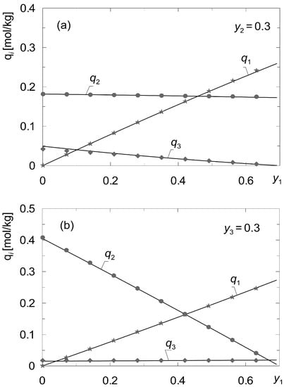 The system of Equation (1) represents the relationship between the changes in the amount of mass in the gas phase and those in the solid, and the molar flux densities in the pores Np and by surface diffusion Ns. In the first term of the right-hand side of Equation (1), the porosity of the solid ε does not appear, as this quantity is incorporated in the definitions of the effective diffusion coefficients. The mathematical model (1) was developed assuming local thermodynamic equilibrium between the adsorbed phase and the bulk phase in the pores at each value of the spatial coordinate z. If the fugacity coefficients of the gas phase components fi are close to unity, then the aforementioned equilibrium is given by the following relationships: