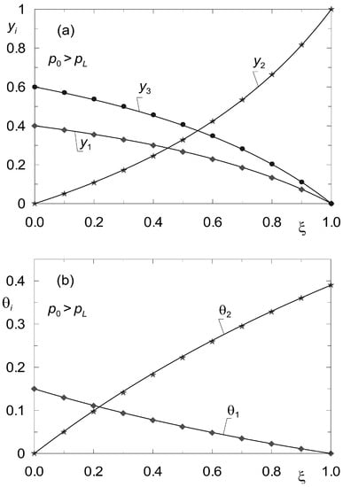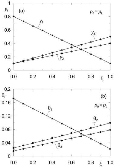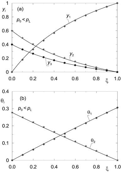 Since the transport of mass in the pores and via surface diffusion are parallel mechanisms, both of these diffusion routes add up algebraically and give the total molar flux density per unit cross section. Due to the assumption of interphase thermodynamic equilibrium (5) and the resulting Equation (7), another approach for the determination of steady states can be proposed. To the best of the authors’ knowledge, such a method has not yet been published. The proposed method takes advantage of the transformed Equations (10) and (26). We illustrate it here using examples of diffusion through flat or cylindrical membranes of small thickness L in comparison with the membrane radius. In these cases, the cylindrical membrane can be treated as flat and one can assume m = 0. Then, the following system of 2 × K nonlinear equations is obtained that needs to be solved: