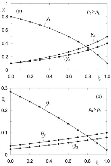 This factor makes computations more difficult, especially when functions (5) are not given explicitly, e.g., when qi values are derived from numerical calculations e.g., according to ideal adsorption solution theory (IAST), real adsorption solution theory (RAST) [] or are obtained on the basis of vacancy solution theory (VST) or from molecular simulations. For this reason, an alternative model, which does not contain a matrix of thermodynamic factors Γ, is presented below, and then a method for the determination of steady states for the discussed complex multicomponent diffusion is proposed.