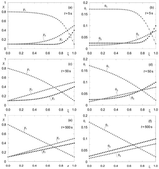 The systems of differential Equations (33) and (34) with boundary conditions (35)–(38) constitute a mathematical model of steady-state complex multicomponent diffusion. On the basis of this model, process analysis can be performed and the influence of the individual constituents, i.e., molecular and Knudsen diffusion, viscous flow and surface diffusion, can be assessed depending on the process conditions. Nevertheless, in order to assess the validity of the model (33)–(38) its reliability should be verified. The method for determining steady states was verified by comparing the results obtained from Equations (33) and (34) with the results obtained according to the dynamic model (8) for sufficiently long time t.