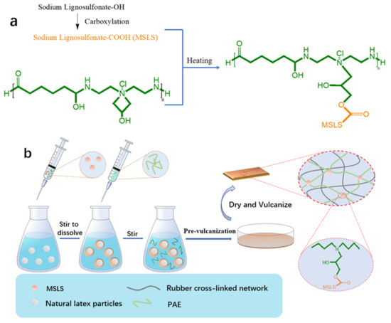 (a) Potential MSLS-PAE crosslinking mechanism, and (b) schematic illustration for MSLS-PAE/NRL double network construction.