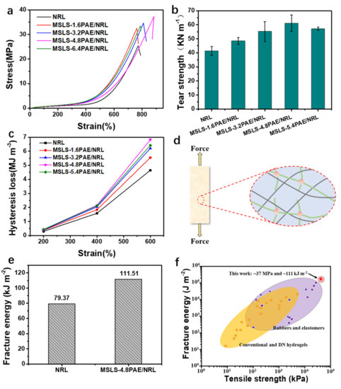 In order to explain the superior mechanical properties of MSLS-4.8PAE, the experiments were analyzed from the perspective of energy consumption from cyclic loading tests, shown in Figure S7. It can be found that the hysteresis loop of NRL was smaller than that of MSLS-PAE, and the hysteresis loop of MSLS-PAE varied with the content of PAE. By calculating the integral area of each hysteresis loop, as shown in Figure 3c, the energy dissipation of NRL was ~4.65 MJ m−3 at 600% strain, while that for MSLS-4.8PAE reached the maximum energy dissipation, valuing at ~6.82 MJ m−3. This may be attributed to the MSLS-PAE crosslinked network working as the first plastic network to preferentially break, leading to the consumption of applied energy and the decline in the rupturing of elastic rubber chains (Figure 3d) [50]. Reported studies show that soft materials containing weak and strong networks can be toughened by sacrificial fracture of weak networks [51,52]. Since the MSLS-PAE worked as an efficient sacrificial network in the matrix and could dissipate much energy rapidly and effectively under deformation, the material was tested for damage resistance characterized by fracture energy [53]. Benefiting from a stiff network constructed by PAE and MSLS, the fracture energy, as expected, reached up to ~111.51 kJ m−2 (Figure 3e) under the optimal dosage of MSLS and PAE, which overtakes toughened nature rubber (~50 kJ m−2) and many synthetic robust soft materials (generally less than 100 kJ m−2, Figure 3f).