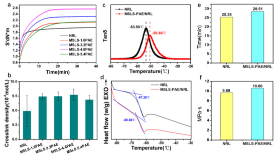 (a) Vulcanization characteristic curve, (b) crosslink density of natural rubber latex with different PAE content, (c) DMA and (d) DSC curves of NRL and MSLS-PAE/NRL, (e) mechanical stabilization time, and (f) viscosity of NRL and MSLS.