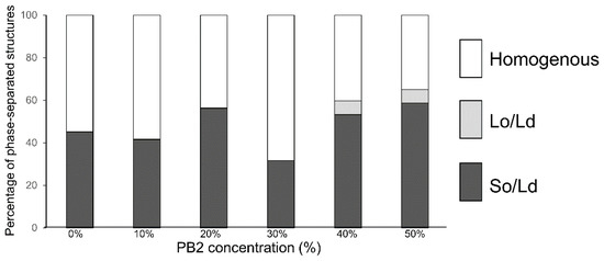 The percentage of phase-separated structures. 1,2-Dioleoyl-sn-glycero-3-phosphocholine (DOPC)/1,2-dipalmitoyl-sn-glycero-3-phosphocholine (DPPC) with various concentrations of procyanidin b2 (PB2) are shown. White, bright gray, and dark gray bars denote homogenous, liquid-ordered (Lo)/liquid-disordered (Ld), and solid-ordered (So)/Ld phases, respectively. Lipid compositions of the observed liposomes in the experiment were DOPC/DPPC/PB2 50:50:0, 45:45:10, 40:40:20, 35:35:30, 30:30:40, and 25:25:50. Based on previous studies, So/Ld phase separation liposomes, DOPC/DPPC 50:50 were used as a control [12,25,26].