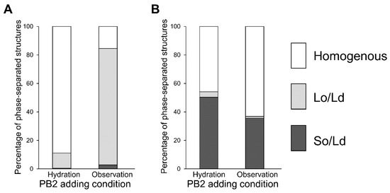 Percentage of phase-separated structures. 1,2-Dioleoyl-sn-glycero-3-phosphocholine (DOPC)/1,2-dipalmitoyl-sn-glycero-3-phosphocholine (DPPC)/cholesterol (Chol) with various additions of procyanidin b2 (PB2) are shown. Lipid compositions of the observed liposomes in the experiment were DOPC/DPPC/Chol (A) 40:40:20 and (B) 50:50:0.