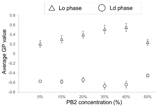 The effect of PB2 on the membrane fluidity of liposomes was examined next by determining the GP values. A high GP value indicates low fluidity of the membranes, whereas low GP values indicate a high fluidic state in the membranes. The GP values are summarized in Figure 5. For PB2 concentrations of 10%, 20%, and 50%, the values were not significantly different; however, when the PB2 concentration was set to 30% and 40%, the values were significantly different. As the value of the Lo phase increased, and that of the Ld phase decreased significantly, a fluidity change occurred in the Lo phase and Ld phase at 20% and 30% PB2, respectively. Although phase-separated liposomes decreased dramatically when PB2 was increased from 10% to 20% (Figure 2), GP decreased significantly when PB2 increased from 20% to 30%. The difference in liquid-ordered and disordered phase fluidities appears to be an important factor for phase separation on the membranes [25,45]. These results are in accordance with previous studies showing that PB2 concentrations of approximately 10% to 30% affect membrane fluidity and result in phase separation. The GP value of Lo at 50% PB2 was very similar to that at zero and for a low percentage of PB2. Thus, it appears that a higher PB2 concentration causes increased fluidity and disturbance to the forming of a liquid-ordered phase.