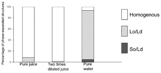 The percentage of phase-separated structures; 1,2-Dioleoyl-sn-glycero-3-phosphocholine (DOPC)/1,2-dipalmitoyl-sn-glycero-3-phosphocholine (DPPC)/cholesterol (Chol) with several concentrations of procyanidin b2 (PB2) containing pure juice, two times diluted juice, and pure water are represented. White, bright gray, and dark gray bars denote homogenous, Lo/Ld, and So/Ld phase, respectively.