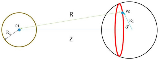 The red ring represents charges on the right charged sphere. Their distance from point P1 is R. α is the angle between vector Z and a vector pointing from the center of the right sphere to any of the points (P2) of the red ring.