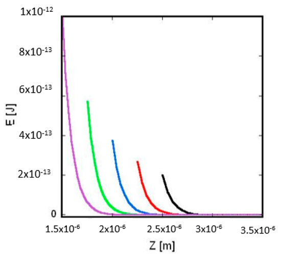 Interaction energy of two charged spheres surrounded by electrolyte (dependence from radius): the interaction energy between the two spheres, 𝐸, is plotted against the distance between the centers of the two spheres, Z. The total charge of the left and right sphere is Q1 = −8.3566 × 10−13 C and Q2 = −3.34265 × 10−12 C, respectively. The radius of the right sphere (see Figure 1) is R2 = 10−6 m, the electrolyte’s ion concentration is C = 0.01 mol/m3, the temperature is T = 300 K and the respective Debye length (calculated by Equation (A2)) is λD = 9.62 × 10−8 m. Purple curve: R1 = 5 × 10−7 m; green curve: R1 = 7.5 × 10−7 m; blue curve: R1 = 1 × 10−6 m; red curve: R1 = 1.25 × 10−6 m; black curve: R1 = 1.5 × 10−6 m.