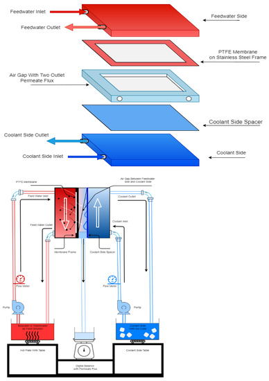 The AGMD module was made from Plexiglas to allow for visual observations. The dimensions of the AGMD module are as follows: 180 mm × 44 mm × 130 mm (length × depth × height). A schematic illustration of the AGMD module is shown in Figure 1. The picture of the AGMD setup used is also given in the Appendix A (Figure A1). Each part of the feed and coolant side has an inlet and an outlet port. The total area of the spacer frame from the coolant side was 0.0084 m2, and the membrane with an effective surface area of 0.0045 m2 was installed on one side of the spacer frame. The feed temperatures were set to 55 °C or 65 °C, and the coolant temperature was maintained at 18 °C. The flow rates of the feed and coolant solutions were 2.4 L/min and 1.6 L/min, respectively, and the flow rate was measured using panel mount flow meters (Blue White, Sterlitech, Auburn, AL, USA). The feed solution was placed on a hot plate (Guardian 500 Hotplate, Instrument Choice, Sydney, Australia) with a thermostat to control the temperature of the feed solution.