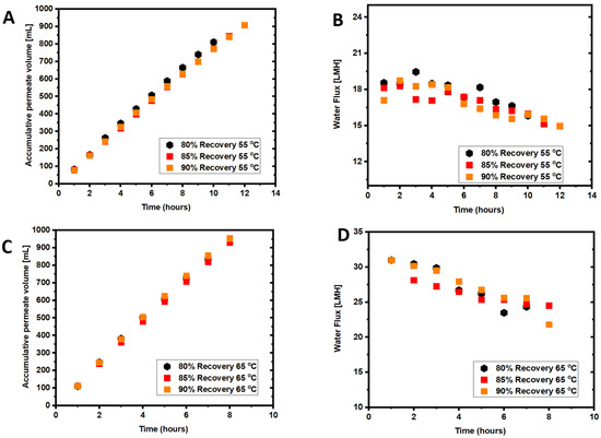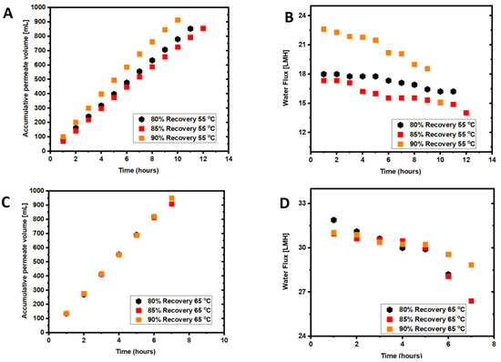 The average DI water flux measured at 55 °C and 65 °C was 18.69 ± 1.2 L/m2h and 30.47 ± 1.5 L/m2h, respectively. The feed temperature in the first set of experiments was set to 55 °C, and experiments were conducted until 80%, 85%, or 90% recovery was reached. The data points in Figure 2A show an increase in the accumulated permeate volume over the processing time. The highest accumulated permeate volume was 908.1 ± 5 mL at a 90% recovery, 880 ± 5 mL at 85% recovery, and 811 ± 5 mL at an 80% recovery. The average permeate flow rate was 81.13 ± 2 mL/h for the 80% recovery, and 76.17 ± 3 mL/h and 75.67 ± 2 mL/h for the 85% and 90% recoveries, respectively. This corresponded to average water fluxes of 18.03 L/m2h, 16.93 L/m2h, and 16.82 L/m2h at 80%, 85%, and 90% recoveries, respectively (Figure 2B). Results showed that the average water flux decreased with the recovery from 80% to 85%, followed by a slight increase in the average water flux when the recovery increased to 90%. The decrease in the flux is expected due to the increase in membrane fouling over time. Higher recovery leads to a higher feed solution concentration and a lower water flux in the long run. The results agree with previous studies that showed a decline in the water flux flow with the recovery increase due to concentration and thermal polarizations [29]. The 90% recovery took a shorter time; therefore, the average flux is higher.
