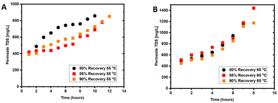 Permeate TDS for seawater treatment: (A) permeate TDS concentration for seawater treatment at 55 °C at 80%, 85%, and 90% recoveries; (B) permeate TDS concentration for seawater treatment at 65 °C at 80%, 85%, and 90% recoveries.
