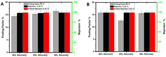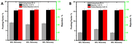 Fouling factor and rejection (A) at 55 °C and (B) at 65 °C.
