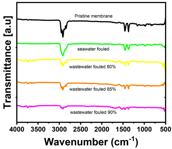 Pristine and fouled membranes were examined with SEM and EDX techniques to visualize and analyze the fouling layer on the membrane surface (Figure 8 and Table 3). The SEM of the pristine membrane shows long fiber-like structures (Figure 8A). These structures are almost invisible in the fouled membranes, indicating the severity of the fouling on the membrane surface. Compared to the pristine membrane, the SEM analysis of the fouled seawater membrane shows a non-uniform cake layer of foulants and a small crystalline salt structure on the surface (red circle in Figure 8B), indicated by the small nodules-like structures in the middle. This is also evident from the EDX analysis, where the Na elemental composition shows the highest percentage for seawater-fouled membranes, followed by Mg (5.82%) and Ca (3.6%) (Table 3). Generally, the concentration of Na in the seawater is the highest among all the ions. The divalent ions in the seawater can also act as a bridge for organics in the seawater, promoting severe fouling on the membrane [30]. The presence of Cl− is also evident from the EDX analysis, which may be due to the ions trapped in the pores of the PTFE membrane. This may indicate NaCl is trapped in the membrane’s pores since Na and Cl− ions follow the same pattern (EDX, Table 3). The high presence of these inorganic elements can also promote membrane wettability and decrease membrane rejection compared to the pristine membrane. Other inorganic foulants, such as S, are also on the membrane surface. S can promote iron sulfide or magnesium sulfate fouling on the PTFE membrane. The EDX analysis shows the presence of metal oxides marked by increased O and metal concentrations. However, an increase in O can also be due to the carbonate or sulfate ions that precipitate as scaling when they form insoluble salts with Mg and Ca ions [36]. FT-IR analysis was used to examine the foulants layer structure, as shown in Figure 9. The sharp peak at 2916 cm−1 can be attributed to the saturated fatty acid chains due to the presence of lipids in ocean water [37]. The reduction in the characteristic peaks of the pristine membrane indicates the formation of a fouling layer [38]. The small peaks observed in the range of 1500–1600 cm−1 in a spectrum of the membrane fouled with landfill leachate suggest the presence of amine related to protein structure [39,40]. This agrees with the EDS analysis, which shows a high N percentage in the fouled membranes with landfill leachate.