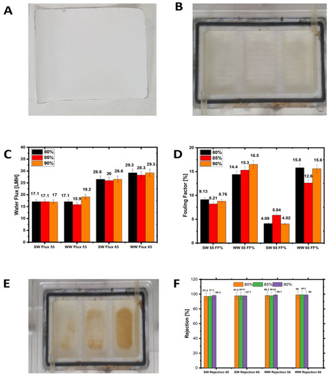 (A) Pristine membrane picture, (B) PTFE membrane after seawater treatment picture, (C) seawater average water flux with the fouling factors at 55 °C and 65 °C for all recoveries, (D) wastewater and seawater fouling factors at 55 °C and 65 °C for all recoveries, (E) picture of fouled wastewater membrane, and (F) comparison of seawater and wastewater rejection at 55 °C and 65 °C for all recovery rates.