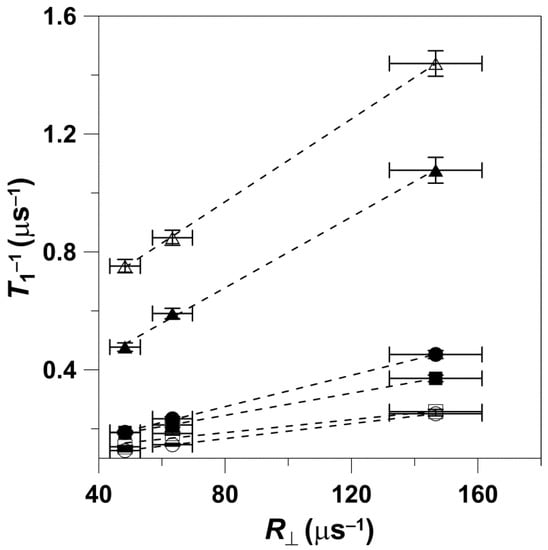 The values for X-band R⊥s and the corresponding T1−1s were obtained from Figures 5 and 6, respectively, in Mainali et al. [5]. The W-band R⊥ values and the corresponding T1−1 values were obtained from Figures 5 and 6, respectively, in Mainali et al. [11]. The linear regression on the data was performed in Origin(Pro) 2019 OriginLab Corporation, Northampton, MA, USA.