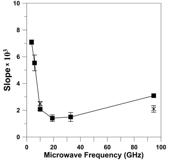 We also analyzed the dependences of T1−1 on the rotational diffusion for frequencies other than X-band and W-band. For this analysis, we took from Figure 4a of Ref. [10] data points for the T1−1 of 5-, 12-, and 16-SASL in DMPC membranes obtained for deoxygenated samples at 27 °C. T1−1 values were obtained for all of these spin labels at S1-, S2-, X-, K-, Q-, and W-bands, thus covering the frequency region from 2.54 GHz up to 94 GHz. With the reasonable assumption that the rotational diffusion of spin labels is independent of microwave frequency, we used values obtained at X-band for appropriate n-PC spin labels (from Figure 1) as R⊥s. The cumulative results are presented in Figure 3. It is clearly shown that the dependence of T1−1 values as a function of the R⊥ values can be fitted with a linear equation at all microwave frequencies. The slopes and intercepts for these linear fittings are presented in Table 2. The slope significantly decreases (about seven times) between S1-band (2.54 GHz) and K-band (18.5 GHz). This tendency is broken at K-band (18.5 GHz) and Q-band (34 GHz) where the slope starts to increase, reaching a value at W-band (94 GHz) even greater that that observed at X-band. Surprisingly, the intercept decreases monotonically with the microwave frequency in all investigated frequency regions, from 2.54 GHz up to 94 GHz. The dependency of the slope and the intercept on the microwave frequency is clearly depicted in Figure 4 and Figure 5. These figures also show the slope and intercept values from Figure 1 and Figure 2. These values obtained for only X-band and W-band fit the results obtained for a broad frequency region.