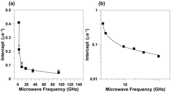 Values of intercepts for the linear dependences of T1−1 as a function of R⊥ presented in Figure 3 (■) are plotted as a function of microwave frequency. Points for intercepts obtained at X-band and W-band, taken from Figure 1 and Figure 2, are included (x). The vertical error bars indicate the magnitudes of standard error of fitting. (b) To better show that the intercept decreases monotonically with the microwave frequency, we displayed the values presented in (a) in the log/log scale.