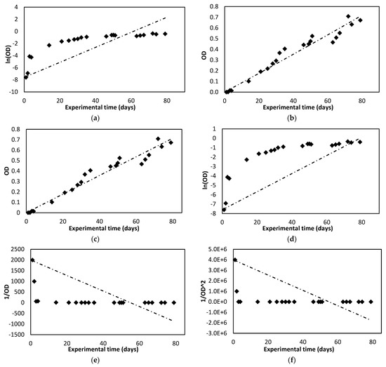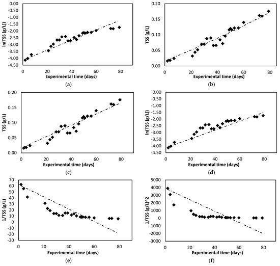 | Kinetic Model | Total Suspended Solids (TSS) | Optical Density (OD) | ||