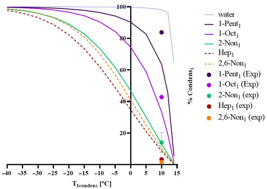 The model developed was applied for a permeate pressure of 1500 Pa, where the percentage of compound i that is condensed/recovered in the first condenser, %Condensi1, was predicted for different values of T1,condens [°C]. Figure 1 shows the simulations obtained for each aroma present in the sardine cooking wastewater and the experimental values acquired, in terms of %Condensi1 (the fraction of each chemical compound i that condenses in the first condenser) versus the temperature of the condenser, T1,condens.