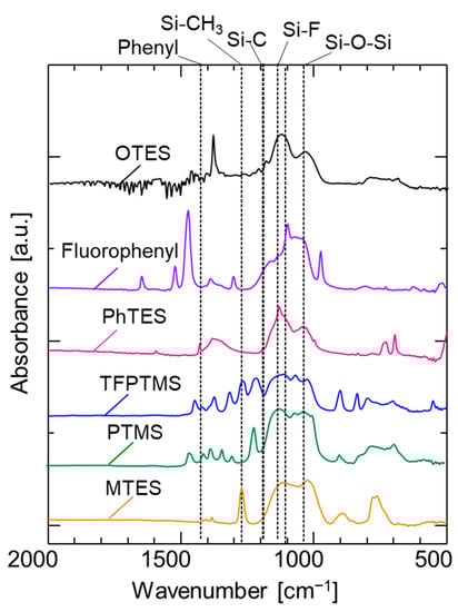FT–IR spectra of various pendant–type organosilica films calcined at 300 °C under a N2 atmosphere.