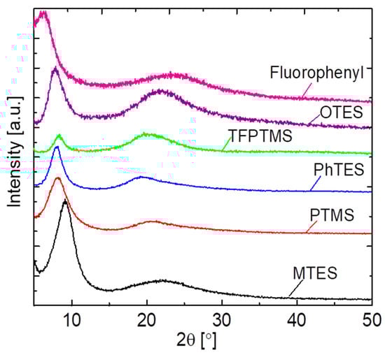 XRD patterns of various pendant–type silica–derived gels calcined at 300 °C under a N2 atmosphere.