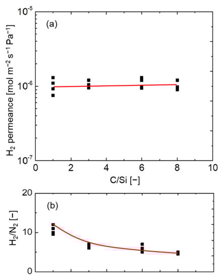 Relationship between the C/Si ratio and (a) H2 permeance and (b) H2/N2 at 200 °C for pendant–type organosilica membranes calcined at 300 °C under a N2 atmosphere.