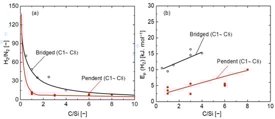 To further evaluate the network pore size of organosilica membranes, a comparative study was carried out based on the relationship between the C/Si ratio and H2/N2 permselectivity, as well as the hydrogen activation energy Ep (H2). It should be noted that the C/Si ratio of bridged–type membranes is half that of pendant types. Figure 4a features the relationship between pendant- and bridged-type organosilica membranes at 200 °C. In bridged–type organosilica membranes, the permeance ratio of H2/N2 was largely decreased as the carbon number increased between the two Si atoms, which could have been a result of the formation of a loose network structure [33,34]. On the contrary, pendant-type organosilica membranes showed a somewhat enlarged pore size with permeance ratios of H2/N2 that were lower than those of bridged–type structures, where higher H2/N2 selectivity was observed.
