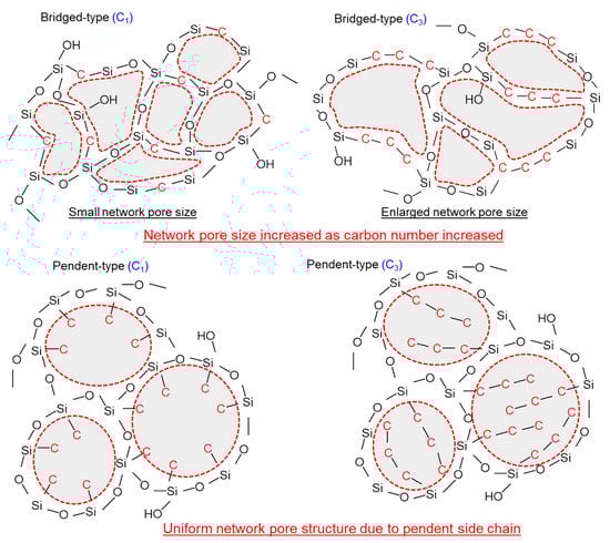 Figure 5 shows the schematic image of the effect that carbon–linking units exert on the network pore sizes of pendant– and bridged–type organosilica structures. The network pore size of bridged–type organosilica membranes demonstrates a dependence on carbon–linking units; as the carbon-linking units between two Si atoms increased, the network pore size of these membranes increased. An increase in the carbon number resulted in flexible linking units that subsequently led to a failure to maintain microporous properties, and a reduction in permeation properties. Conversely, the pendant–type alkoxysilane structure showed a similar pore size, although the carbon number was higher. A possible reason for the enlarged network pores in the pendant alkoxide structure could have been the existence of hydrophobic pendant side chains, which could have aggregated in the pore wall, and would have resulted in an enlarged network pore size.