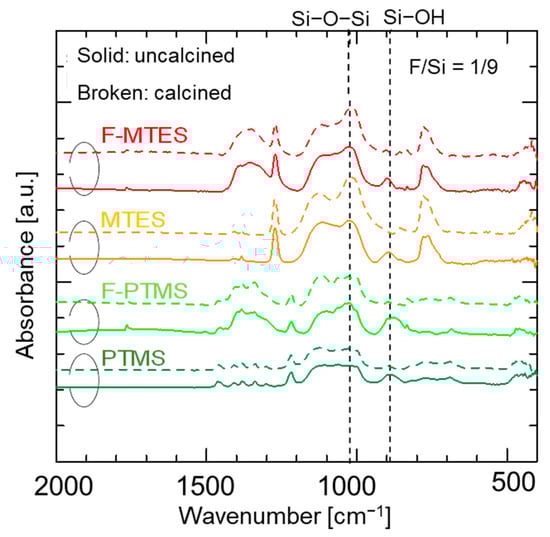Figure 6 shows the FT-IR spectra of fluorine-doped (F/Si = 1/9) and undoped pendant–type (MTES and PTMS) organosilica network structures before/after calcination at 300 °C. A Si–O–Si peak around 1100 cm−1 was observed in all samples irrespective of the fluorine doping, which indicates the completion of hydrolysis/condensation reactions during the sol–gel process. Another peak centered around 900 cm−1 is ascribed to the silanol groups (Si–OH) present in the sample. However, no apparent difference was observed in the absorption peaks of silanol groups (Si–OH) in either fluorine–doped or undoped samples. Table S1 summarizes the Si–OH/Si–O–Si peak-area ratios of fluorine– doped and undoped samples before/after calcination. The results indicating a slight decrease in silanol groups (Si–OH) after fluorine doping were obtained for both forms of pendant–type organosilica network structures. It should be noted that various studies have reported that fluorine significantly decreases the silanol density (Si–OH) of conventional silica (TEOS) and bridged–type organosilica (BTESM, BTESP) network structures [25,26,27]. This effectiveness of fluorine is associated with a decrease in the silanol density (Si-OH) perturbed by the presence of Si–F and C–F groups in the bridged–type organosilica network structures [35]. However, the present status of fluorine effectiveness in the pendant–type organosilica network structure seemed to be lessened by the existence of pendant–chain aggregation, which might have restricted the chemical bond formation of fluoride ions with silicon (Si–F) and carbon (C–F), as reported in fluorine–doped silica network structures [26].