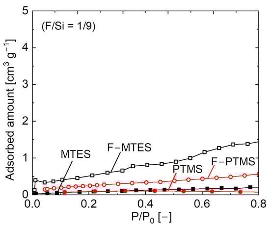 N2 adsorption isotherms of fluorine–doped (F–MTES, F–PTMS) and undoped (MTES, PTMS) pendant–type organosilica gels calcined at 300 °C under a N2 atmosphere.