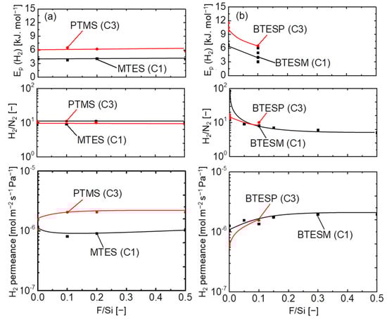 On the other hand, bridged–type organosilica membranes showed a strong dependence on the carbon number present between two Si atoms. The effect of carbon linking units was apparent when the BTESM (Si–C1–Si) with a single carbon showed a higher level of H2 permeance compared with that of BTESP (Si–C3–Si), with three carbons between two silicon atoms. Although previous studies have reported that permeation properties were improved as the carbon number increased, the flexibility of organic linking units could have decreased the H2 permeance in BTESP membranes [21,37]. Long–chain organosilica membranes are known to block pores due to space occupation, and these are not considered effective for the fabrication of highly permeable gas–separation membranes. After fluorine (NH4F) incorporation, improved permeation properties have been reported irrespective of the organic linking units, which demonstrated an enlarged network pore size that was caused by Si–F and C–F bonds [27,35]. H2/N2 selectivity and Ep (H2) decreased as the fluorine concentration increased (F/Si = 0–5/5), which indicates a loose network formation. Network pore sizes of organic/inorganic silica membranes have been controlled effectively with appropriate fluorine concentration. These results further proved that the significance of fluorine in bridged–type organosilica is independent of the Si precursor.