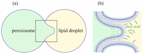 The contact of a lipid droplet with a peroxisome, an organelle responsible for the oxidation of free fatty acids (FFAs), is the least understood. Available experimental data [26] indicate that during fusion with a lipid droplet, peroxisomes can form specific structures, called pexopodia, representing lipid monolayers, invaginated into the lipid droplet’s core (see Figure 1). These structures have unique features and arise under specific conditions. According to Binns and coworkers [26], pexopodia were observed predominantly under the deficiency of a hydrocarbon source in cells grown on oleate nutrition. The emergence of such structures can be associated with the formation of free fatty acids in the core of the lipid droplet. This suggestion is indirectly confirmed by the accumulation of enzymes involved in fatty acids beta-oxidation in the pexopodia proximity in peroxisomes [26]. Localization of beta-oxidizing enzymes near the monolayer membrane separating the peroxisome from the lipid droplet hints that FFAs need to diffuse through this monolayer for oxidation to occur. If peroxisomes are deficient in oxidizing enzymes, they can form tubular structures named “gnarls”. These structures protrude deep into the lipid droplet core and are thought to be composed of FFAs accumulated at the pexopodia surface and unable to be oxidized.