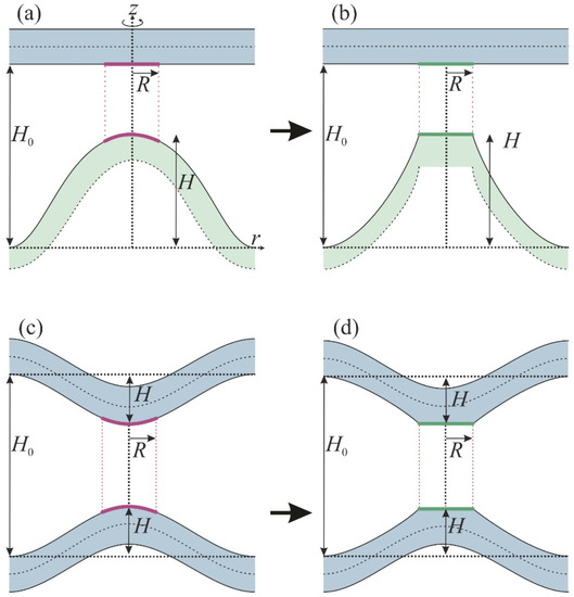 Schematic representation of the membrane remodeling prior to stalk formation in the cases of monolayer–bilayer (panels (a,b)) and bilayer–bilayer (panels (c,d)) fusion. The initial distance between the membranes is equal to H0, the height of the monolayer dimple is denoted by H and the total height of bilayer dimples in (c,d) is 2H. Radius R of the dimple limited the effective area of hydration repulsion, denoted by crimson on panels (a,c), and hydrophobic interaction, denoted by green on panels (b,d). The bilayer membrane is colored blue-green and the monolayer membrane is colored ghostly green. Note the axial symmetry of the system.