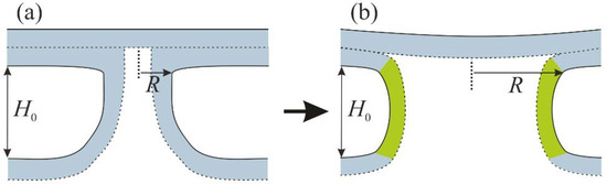 Schematic representation of the π-shaped structure model. (a) Origination of the π-shaped structure after stalk formation. (b) Expansion of the π-shaped structure; transition zones between the fusing membranes are colored in green. Other parts of the lipid membrane are highlighted in blue. R is the structure radius; H0 is the fixed distance between the membranes.