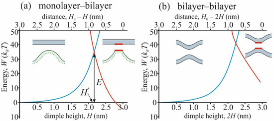 Energies W1bil and W2bil of the system with dimples and the system with hydrophobic defects were introduced by analogy with the previous case as W1bil = Webil + Whbil and W2bil = We2bil + Wfbil. The height of the barrier was calculated in the same way as for the monolayer–bilayer system. It should be noted that, in the case of monolayer–bilayer fusion, stalk formation corresponded to H = H0, since the bilayer was assumed undeformed; while in the case of bilayer fusion, due to the symmetry of the system, stalk formation corresponded to H = H0/2.