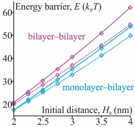 This energy barrier decreased with the addition of components with negative spontaneous curvature, which relieved the elastic stress of the stalk, fitting the negative mean curvature of this structure. Thus, the addition of 50% DOPE could drop the barrier by ~20 kBT [44,54], qualitatively agreeing with our results. The decrease in the initial intermembrane distance H0 reduced the deformations required for the approaching of the membranes, and led to the dehydration of the proximal lipids, facilitating the opening of the hydrophobic defect. Thus, a decrease in the H0 from 2.5 to 1 nm could drop the energy barrier by ~20 kBT [44], which agrees with our findings (Figure 5). Energy barriers obtained in molecular dynamics simulations also agreed with our theoretical estimations. Thus, the generalization of our model to the case of bilayer fusion, despite its simplifications, gave results quantitatively consistent with the literature data and could be considered as validation of our model.
