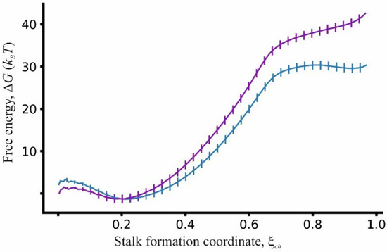 We also measured the free energy barrier for bilayer–bilayer and bilayer–monolayer stalk formation utilizing molecular dynamics simulations. To this end, we used umbrella sampling to calculate the dependence of the system energy ΔG on the reaction coordinate ξch in both cases. The results of these calculations are depicted in Figure 6.