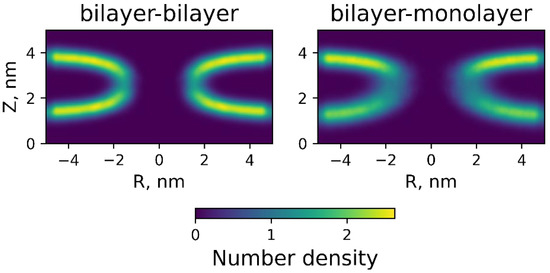 The density maps were calculated from the 100 ns trajectory with constant chain coordinate ξch = 1. The density map of the stalk formed by bilayers was symmetric and had a clear outline in the stalk region. Contrary to this, the stalk formed by the bilayer and monolayer had an asymmetric profile deformed towards the bilayer. Moreover, the density in the stalk region was more vague and did not have a clear contour, which indicated the more dynamic stalk structure for the bilayer–monolayer system.