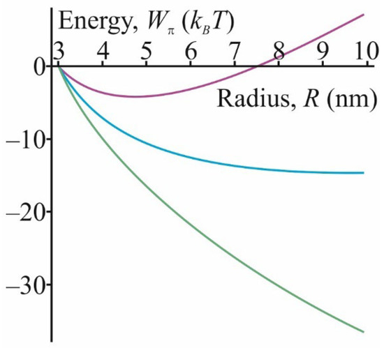 To investigate the behavior of the system after stalk formation, we calculated the energy Wπ of the π-shaped structure depending on the radius R according to the Formula (11). This expression could be considered as an approximation of the energy for sufficiently large radii R > H0 when the equatorial curvature could be considered constant and zero. The spontaneous curvature Js of the membrane could be changed by modifying the transition zone between the membranes with FFAs, such as oleic acid (OA). The membrane spontaneous curvature should have decreased upon insertion of FFAs since they increased the volume of the hydrocarbon region of the membrane, keeping the headgroup region almost intact. According to that, we calculated the energy Wπ dependence on radius R for the values of Js = −0.1 nm−1, Js = −0.15 nm−1 and Js = −0.2 nm−1. These dependencies are shown in Figure 8. Note that the graphs presented describe the behavior of the π-shaped structure in the case of large values of R, while stalk formation occurred at a small radius ~1–2 nm. Earlier, the case of intermediate values of the radius was considered in work [27], and it was shown that the transition to large radii was associated with overcoming a small energy barrier of ~5–10 kBT height. We believed that this barrier was negligible and did not affect the state of the system.