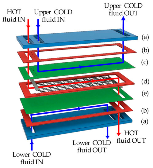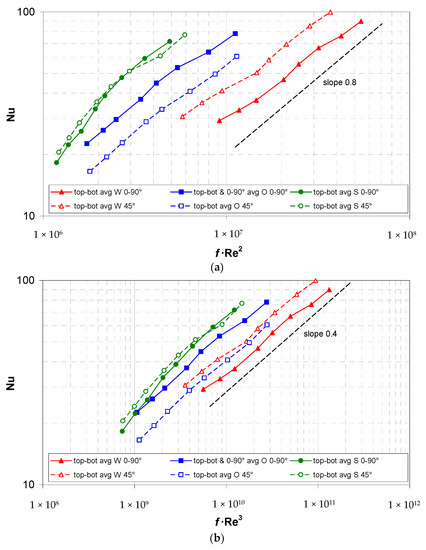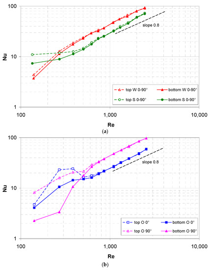 Figure 9a,b. For the sake of clarity, in all of the cases, the reported mean Nusselt number is an average between the top and bottom values, and only cases with Re > 500, wherein it was negligibly affected by the buoyancy effects, are included. Moreover, in order to allow for an easy comparison with the W and S geometries, for the overlapped (O) spacer that was oriented at 0–90° with respect to the flow direction also the relevant 0° and 90° values have been averaged.