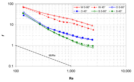 The results show that the flow attack angle affected f significantly only in the case of the woven spacers, where the 0–90° orientation yielded values of f that are up to 60% higher than they are in the 45° orientation. For the other two geometries (overlapped and spheres spacers), the difference is much lower (~10% or less).