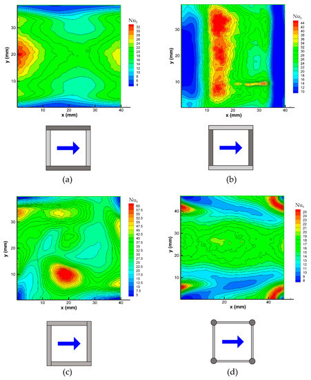 h are attained in the central region of the sides, lying above the opposite filaments (adjacent to the 90° wall), where the flow passage area is restricted and the local velocity is at its highest. The mean Nusselt number, which was computed from Equation (5), is ~16, (see